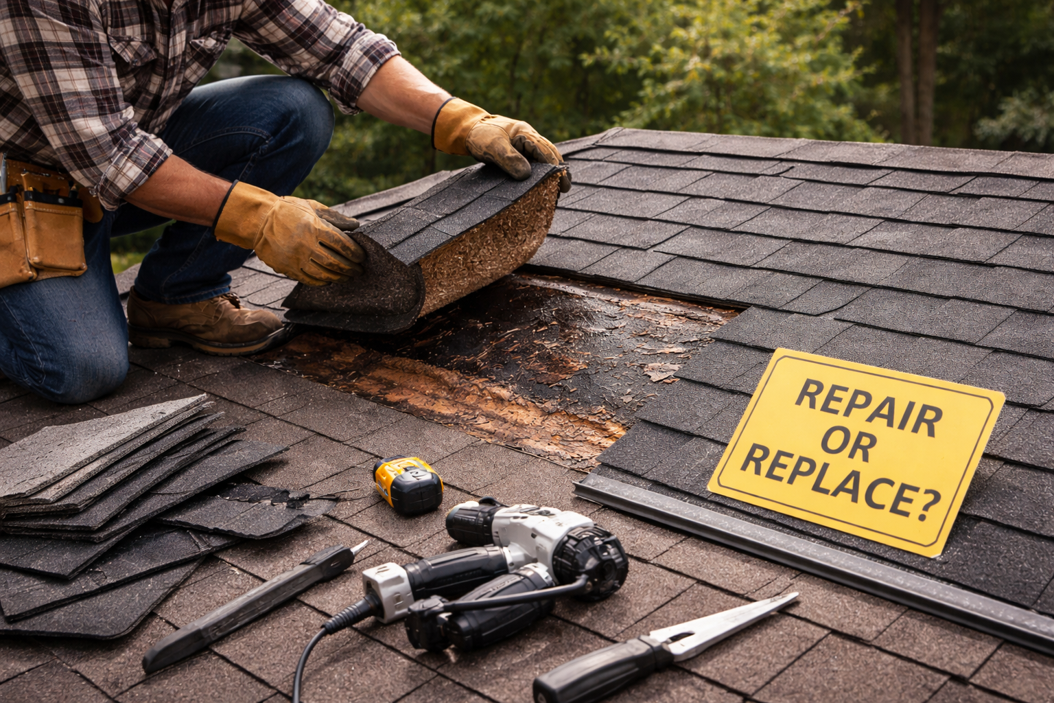 Roof Age: Under 10 years favors repair; over 15 years favors replacement